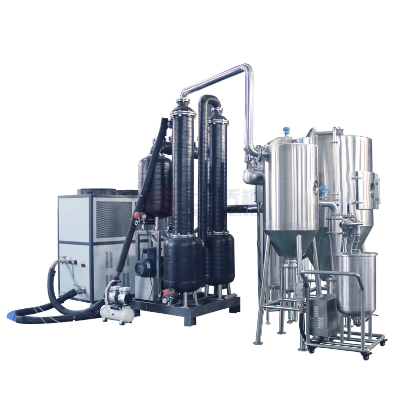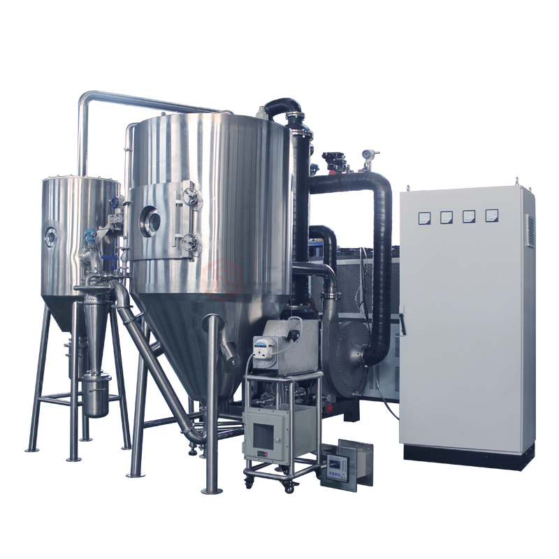 設備主要由:送料系統、加熱系統、霧化系統、噴霧干燥系統、惰性氣體循環系統、產品回收系統、冷凝系統組成。